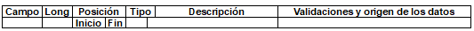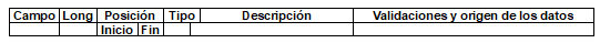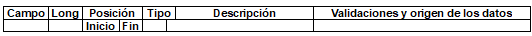 | 1 | 2 | 1 | 2 | N | Tipo de registro. | Obligatorio. Debe ser 11. Lo genera el sistema del operador de información. |