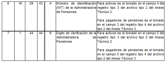| 8 | 1 | 49 | 49 | N | Dígito de verificación de la CCF. | Para activos es el tomado en el campo 5 del registro tipo 7 del Anexo Técnico 2. Para pagadores de pensiones es el tomado en el campo 5 del registro tipo 6 del Anexo Técnico 3. |