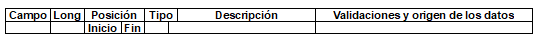 | 1 | 2 | 1 | 2 | N | Tipo de registro. | Obligatorio. Debe ser 8. Lo genera el sistema del operador de información. |