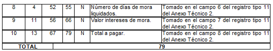 | 9 | 11 | 56 | 66 | N | Valor intereses de mora. | Tomado en el campo 7 del registro tipo 11 del Anexo Técnico 2. |