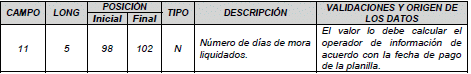 845255NNúmero de días de mora liquidados.Tomado en el campo 6 del registro tipo 11 del Anexo Técnico 2.