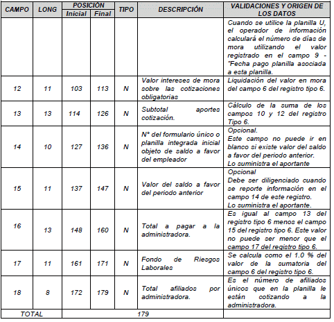 Este registro contiene la información del valor total a pagar por el aportante a cada uno de los sistemas en el período liquidado; así como el total de cotizantes a los subsistemas de pensiones, salud, riesgos laborales y cajas de compensación familiar; y el número de administradoras de pensiones, número de EPS, EOC, o regímenes de Excepción, número de administradoras de riesgos laborales y números de cajas de compensación familiar reportadas. Por cada planilla reportada en el archivo, registros tipo 1 de este anexo, existe un registro tipo 12