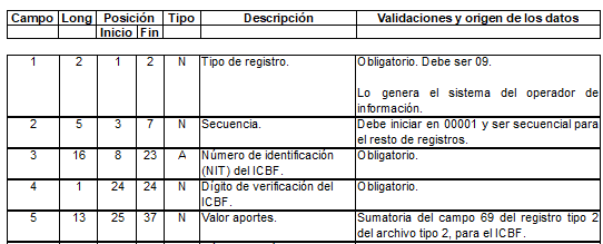 Este registro solo se diligencia en las planillas de activos, contiene la información correspondiente al Instituto Colombiano de Bienestar Familiar, ICBF. Por cada planilla reportada en el archivo, registros tipo 1 de este anexo, existe un registro tipo 9 si al menos existe un registro tipo 2, datos generales del cotizante que reporte aporte al ICBF.