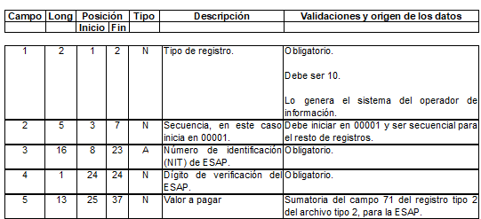 2.10.1 Estructura de datos del registro de salida tipo 10. Total de aportes de la planilla para el período a la ESAP