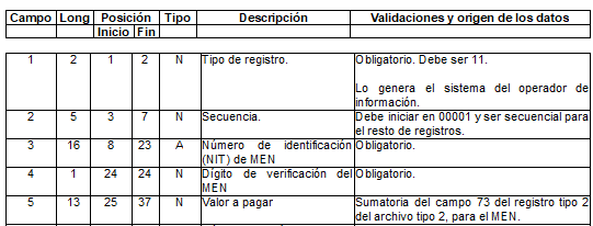 Este registro solo se diligencia en las planillas de activos, contiene la información correspondiente al Ministerio de Educación Nacional (MEN). Por cada planilla reportada en el archivo, registros tipo 1 de este anexo, existe un registro tipo 11 si el aportante tiene la obligación de al Ministerio de Educación Nacional.