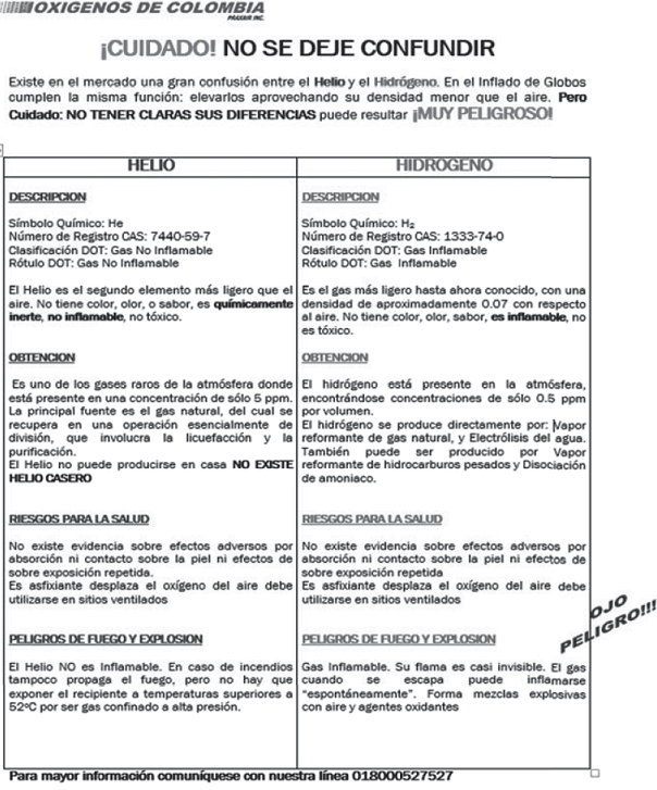 En lo que tiene que ver con el uso del gas Hidrógeno como sustituto del Helio en el inflado globos, considera que es por desconocimiento del riesgo y del peligro que conlleva el manipular y/o exponer a niños o adultos a un gas tan explosivo como el Hidrógeno, y a la oportunidad de negocio que esta actividad representa debido a la diferencia entre el costo del gas Helio, frente al gas Hidrógeno.