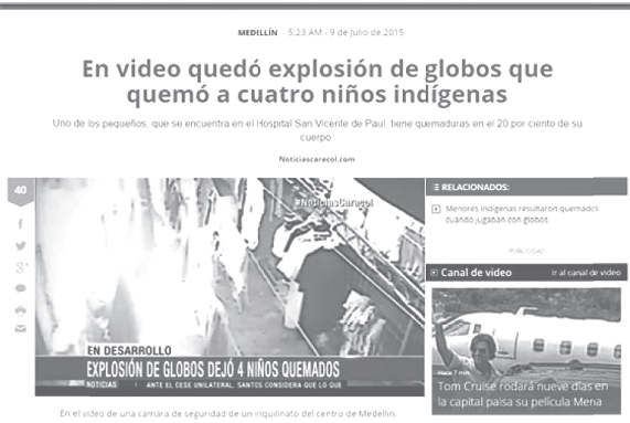 34. http://www.noticiascaracol.com/medellin/en-video-quedo-explosion-de-globos-que-quemo-cuatro-ninos-indigenas Versión revisada el 26 de agosto de 2015. Folio 166 (CD).